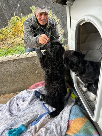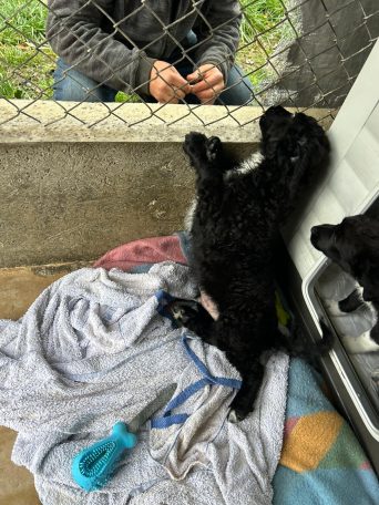 Hier ist es kalt und laut, aber immerhin haben wir uns. Wir spielen sehr gerne zusammen und kuscheln uns in unsere Hütte. Wenn wir Besuch von den Pflegern bekommen, kann ich mich kaum halten und freue mich sehr. Da darf das an den Händen knabbern und lecken nicht fehlen!