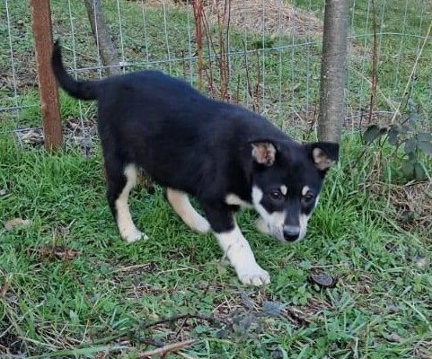 Sie teilt sich ihr Gehege mit vielen anderen Junghunden und zeigt sich welpentypisch verspielt, neugierig und aufgeschlossen.