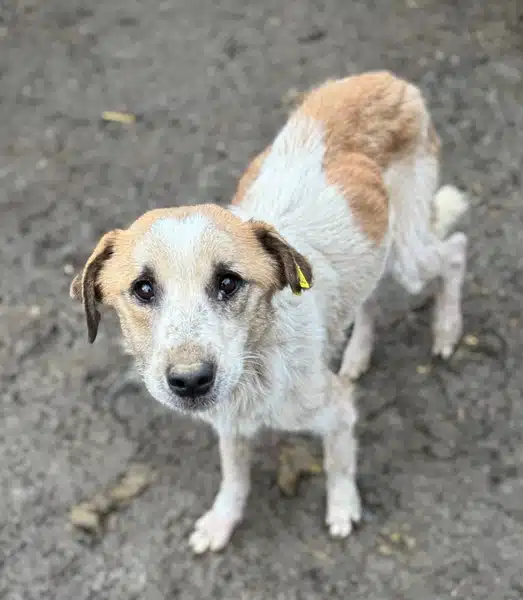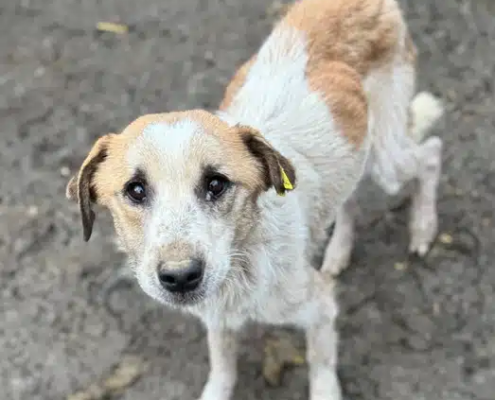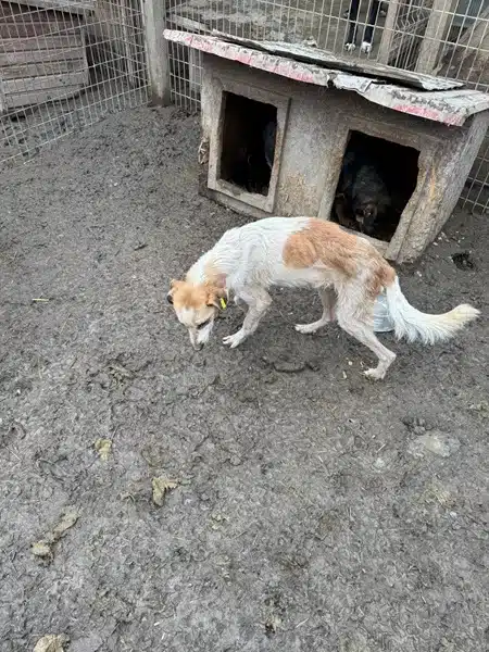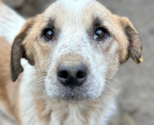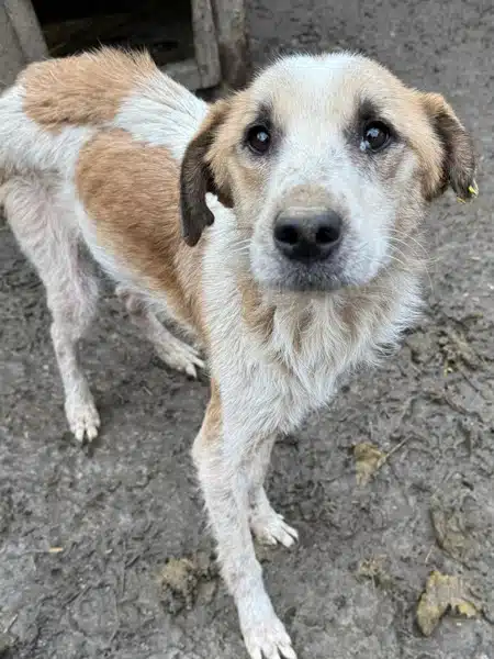 Der hübsche Lucky ist zum schlimmen Notfall geworden. Wir fanden den Buben völlig abgemagert und von Hautproblemen gezeichnet in seinem Kennel vor. Wir stellten ihm Wasser und Futter in die Hütte, das fraß er auch gierig. Er erledigte aber auch seine Geschäfte in der Hütte und schien sich vorerst nicht raus zu trauen. Lucky nimmt Leckerchen aus der Hand und ist in unserer direkten Nähe, aber Streicheleinheiten kennt er nicht und findet sie deshalb noch gruselig. Er sollte dringend ausreisen, denn so hat er dem kalten Winter überhaupt nichts entgegenzubringen.